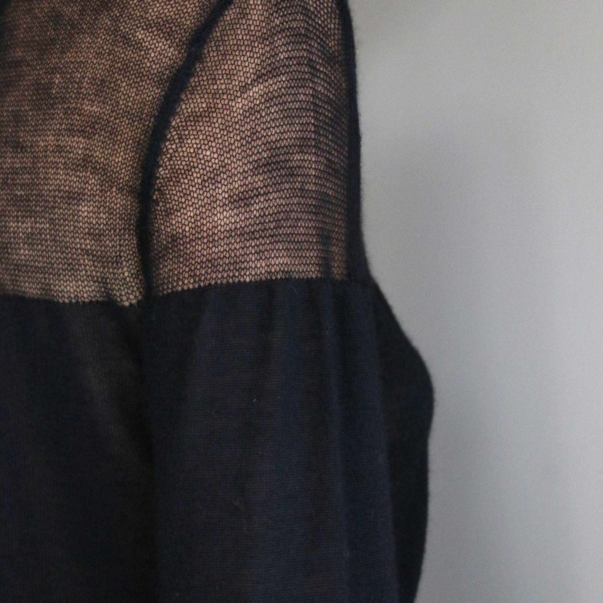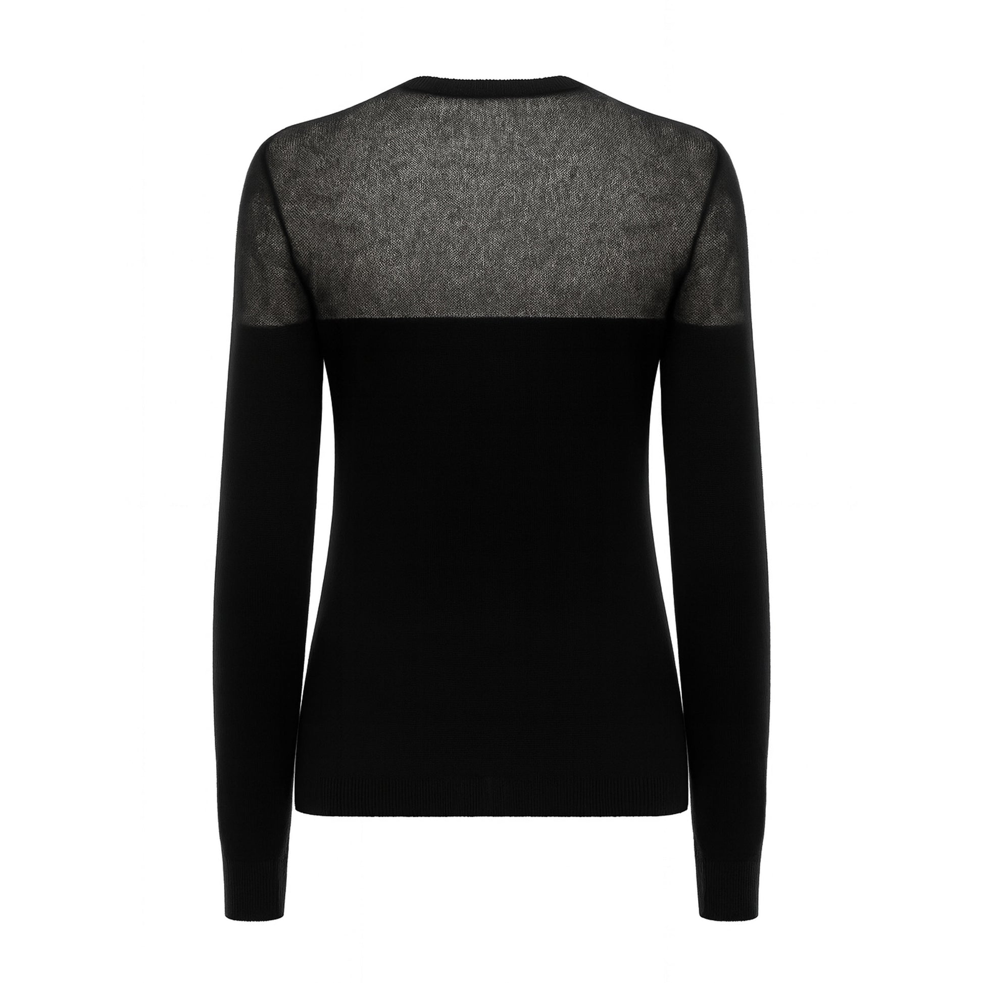 Crafted from fine black cashmere, the body of the sweater is knitted in a classic full jersey, creating a soft drape that embraces comfort without compromising elegance. The upper bust, shoulders, and sleeves feature a delicate drop-needle net knit, revealing a semi-sheer effect that brings lightness and visual depth to the piece.