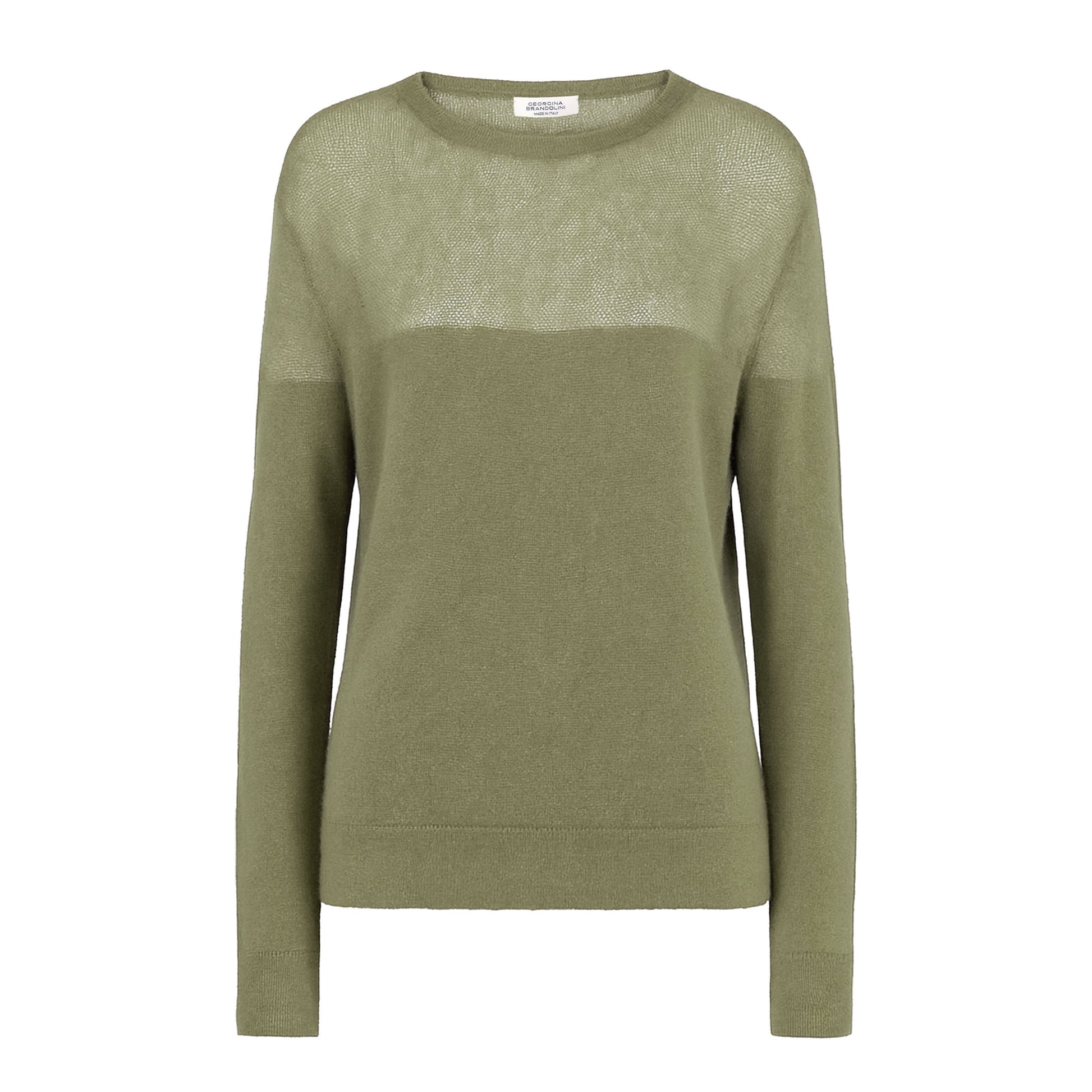 Crafted from fine grey-green cashmere, the body of the sweater is knitted in a classic full jersey, creating a soft drape that embraces comfort without compromising elegance. The upper bust, shoulders, and sleeves feature a delicate drop-needle net knit, revealing a semi-sheer effect that brings lightness and visual depth to the piece.